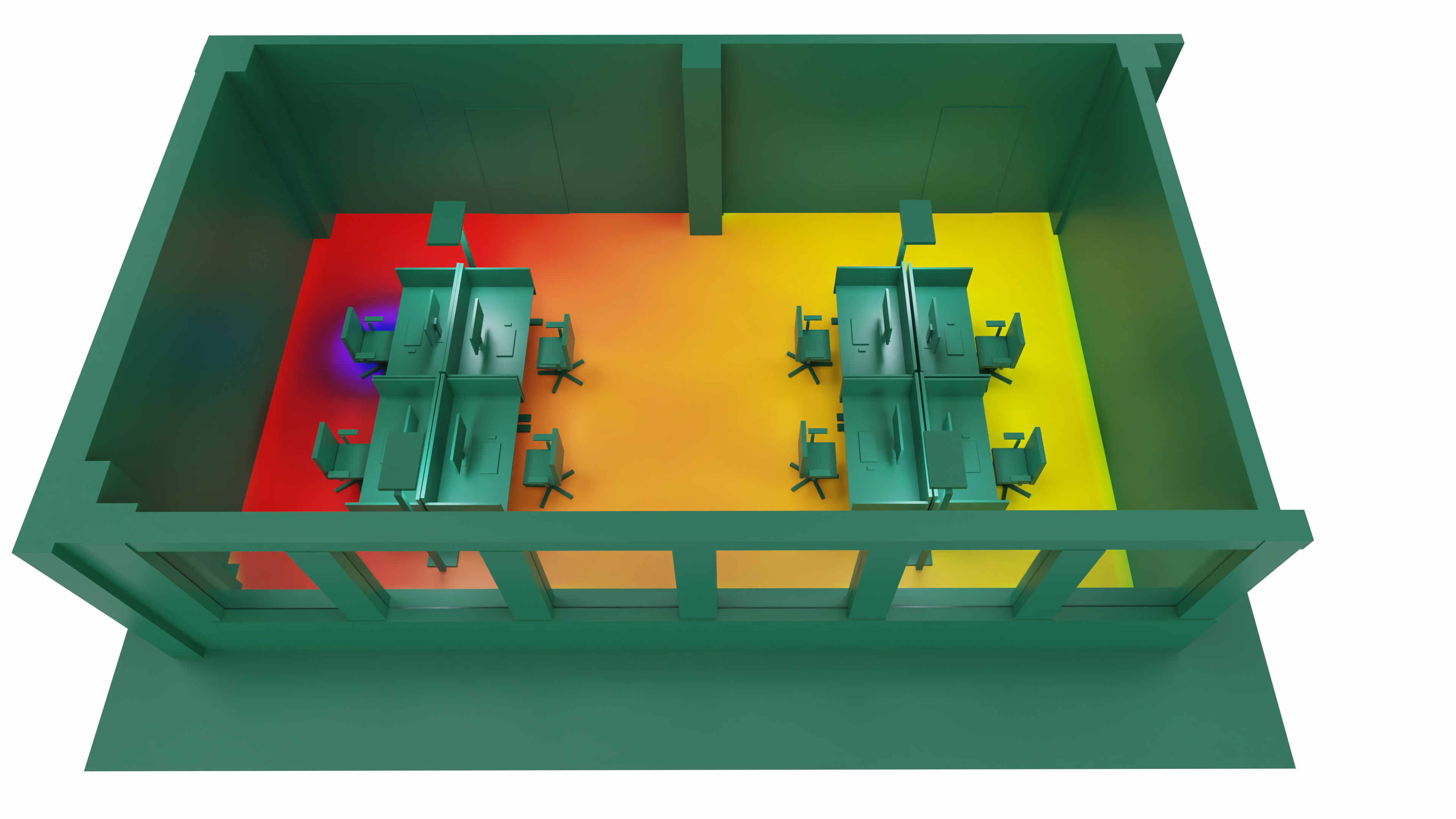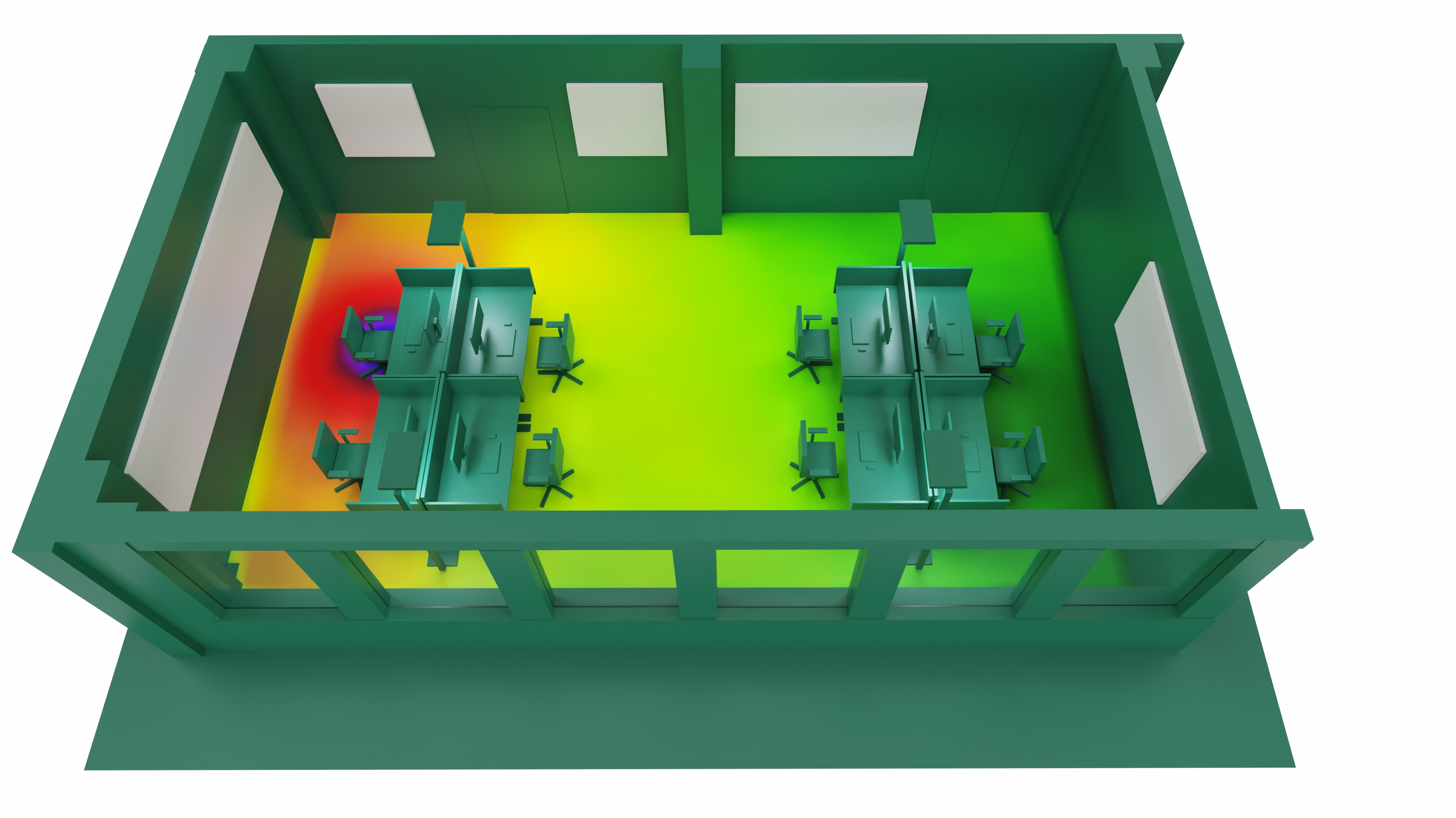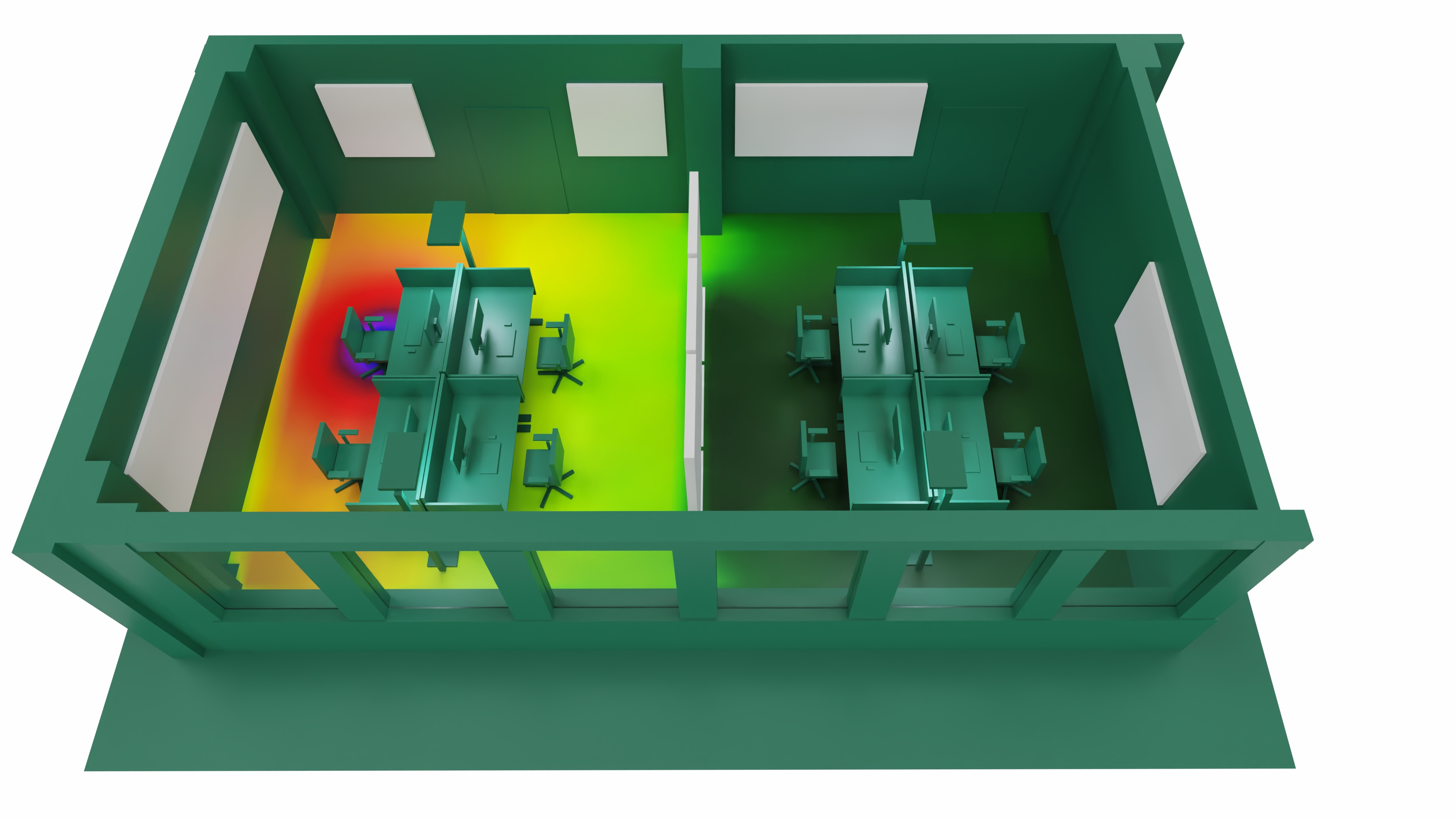 Visualisierung der Schallausbreitung in einem Mehrpersonenbüro ohne akustische Maßnahmen: